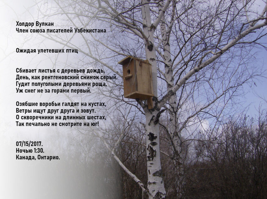 Холдор Вулкан — Абдусаломов Холдор Усманович родился в 1959 году в Узбекистане. Окончил Ташкентский Национальный Университет. Написал 4 сборника стихов, 5 повестей, десятки рассказов и 2 романа на двух языках, на узбекском и на русском. Так же Холдор Вулкан переводил произведения многих японских поэтов на узбекский язык.Он является членом союза Писателей Узбекистана с 1999 года. Его литературные произведения переведены на английский язык. Не имеет званий и наград.
